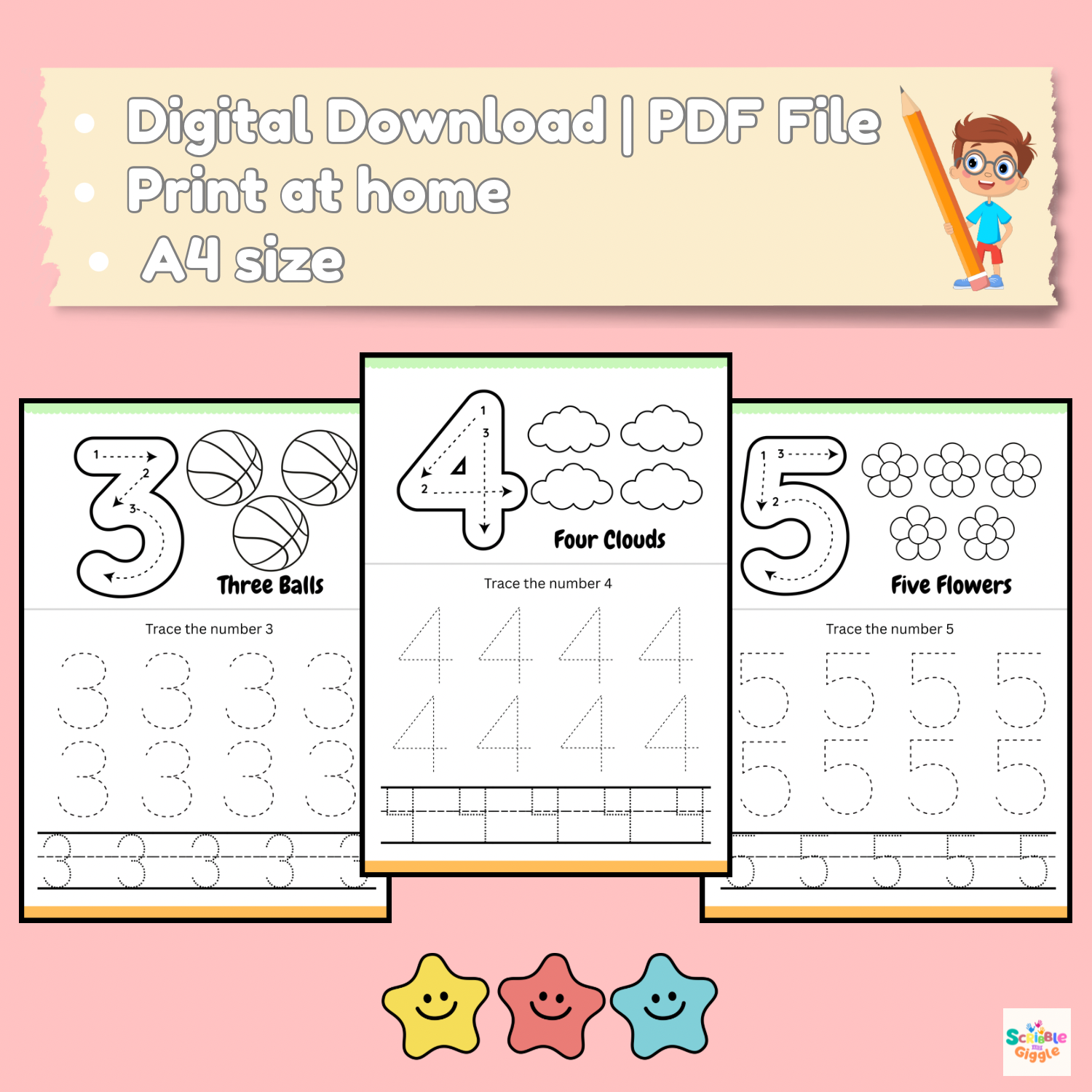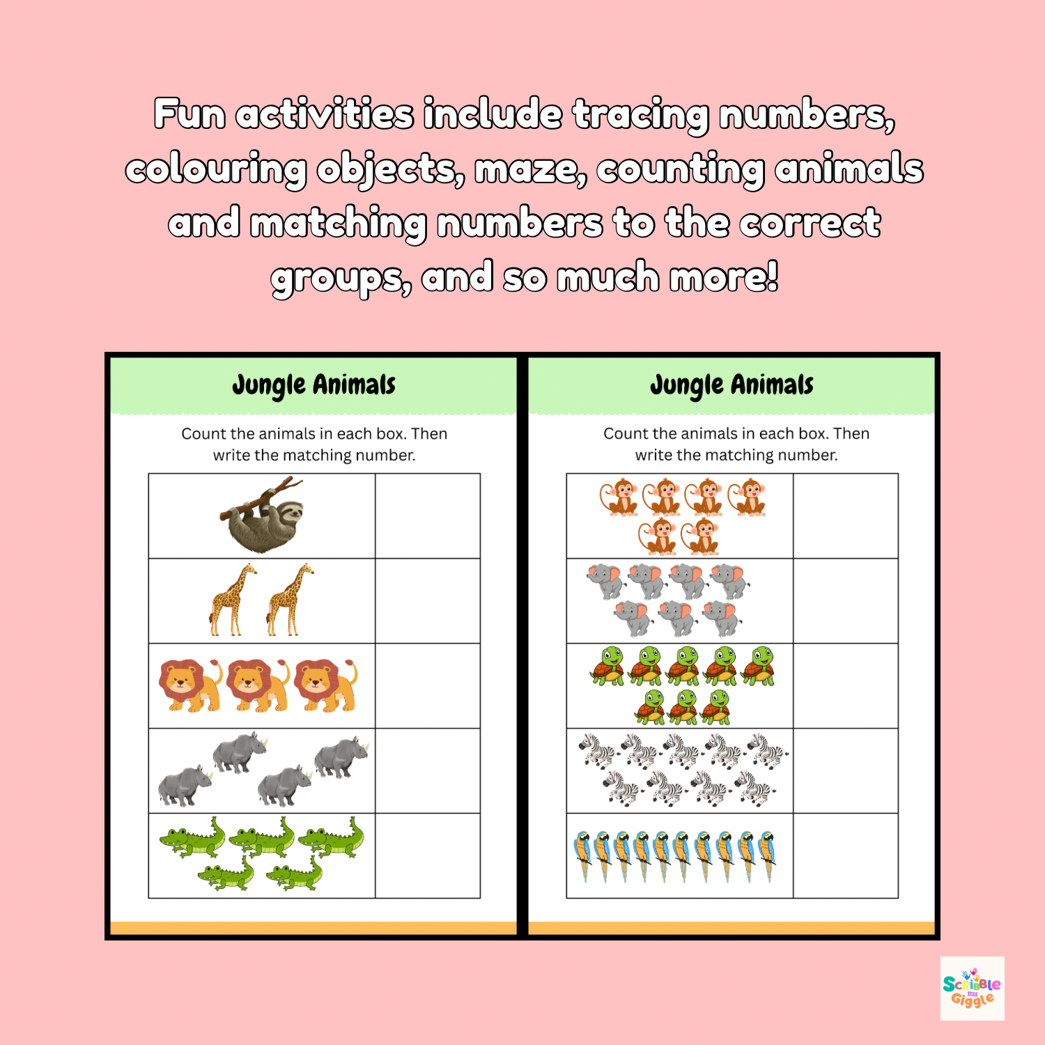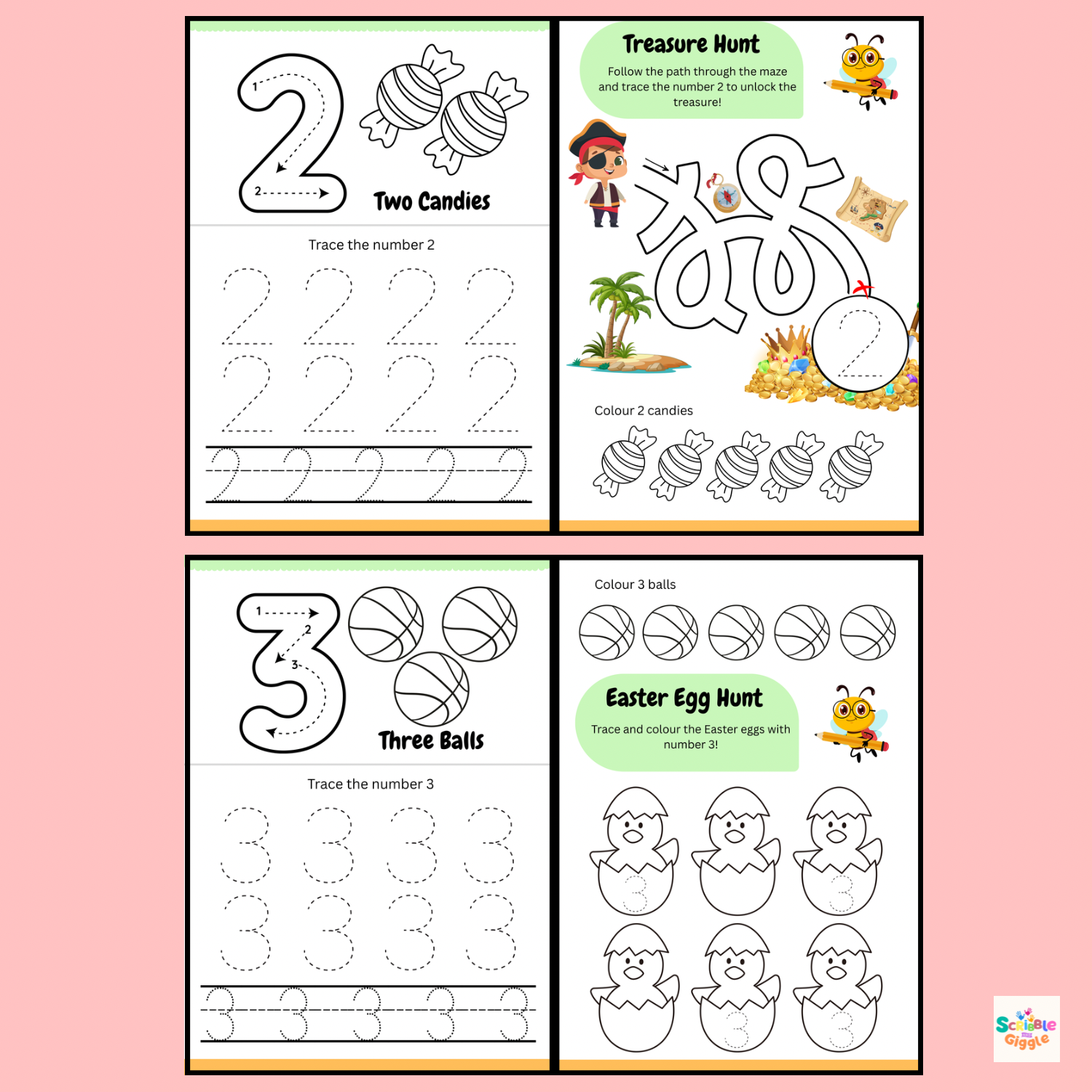 Turn number practice into play with these fun and engaging 25-page number tracing worksheets! Kids will explore numbers 1–10 through tracing, colouring, and interactive activities like mazes, animal counting, and number matching. With plenty of variety, these worksheets help toddlers and preschoolers build early math and fine motor skills while having fun.